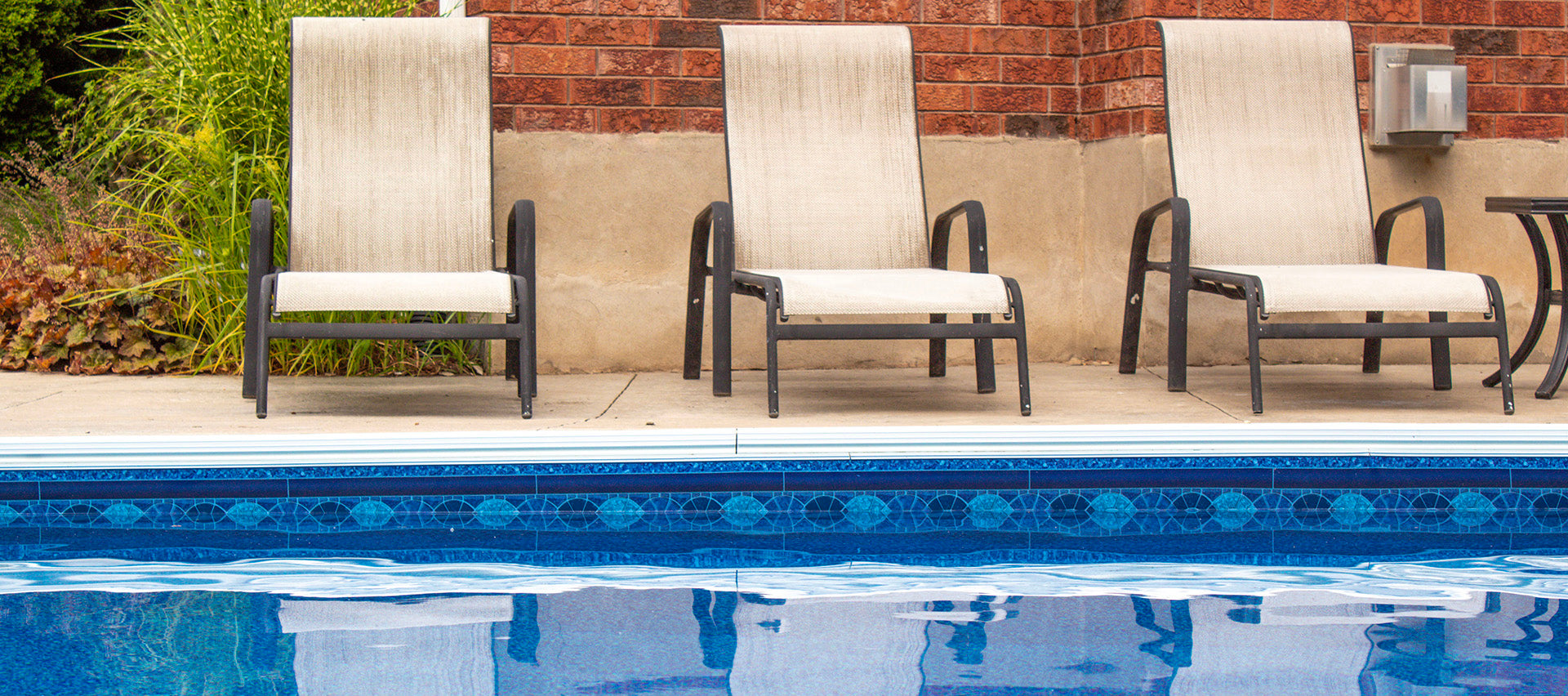 A bold serpentine mosaic border in teal stone tiles. Paired with the Blue Pebble pool liner, it is finished with a medium blue coating.