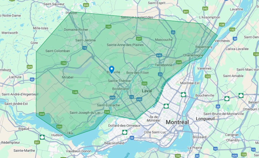 Service offert dans les ville suivante: Laval, Blainville, Boisbriand, Bois-des-Filion, Deux-Montagnes, Lorraine, Mirabel, Rosemère, Saint-Eustache, Sainte-Thérèse, Saint-Jérôme, Sainte-Anne-des-Plaines, Saint-Augustin, Saint-Colomban, Terrebonne, Charlemagne, Mascouche, Repentigny, Lachenaie, Sainte-Agathe-des-Monts, Prévost, oka
