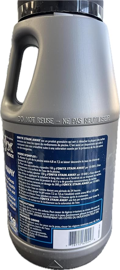 Onyx Stain Away est un puissant dĂ©tachant granulaire conçu pour Ă©liminer les taches de mĂ©taux (fer, cuivre, manganĂšse) sur tous types de revĂȘtements, y compris la fibre de verre, sans avoir besoin de vidanger lâeau de votre piscine.